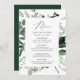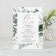 Elegant wedding menu featuring "Menu" displayed in a modern calligraphy script and menu details framed by eucalyptus, fern, and other rich greenery on a white background. Personalize the botanical wedding menu with your names, wedding date, and dinner menu. The simple wedding menu reverses to a solid dark green background with space for photos and additional text. Designed to coordinate with our Abundant Greenery wedding collection.
