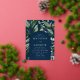 Elegant wedding invitations featuring your wedding details nestled inside of an arched navy and gold foil frame surrounded by eucalyptus, ferns, and other rich greenery. The botanical arch wedding invitations reverse to a solid dark green background. Designed to coordinate with our Abundant Greenery wedding collection.