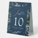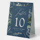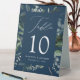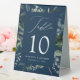 Elegant botanical wedding table card tent sign featuring the table number, your names, and wedding date nestled in a rectangular frame surrounded by eucalyptus, ferns, and other rich greenery. The navy background adds a touch of sophistication, highlighting the lush botanical elements. Personalize the number for each table card and add it to your cart to create a refined and nature-inspired atmosphere at your wedding reception. Perfect for modern, botanical, or elegant wedding themes.