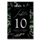 Elegant, botanical wedding table cards featuring the table number, your names, and wedding date nestled in a rectangular frame surrounded by eucalyptus, ferns, and other rich greenery on a black background. Personalize the number for each table card and add it to your cart. Designed to coordinate with our Abundant Greenery wedding collection.