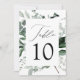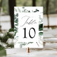 Elegant, botanical wedding table cards featuring the table number nestled in a rectangular frame surrounded by eucalyptus, ferns, and other rich greenery. Personalize the number for each table card and add it to your cart. The 5x7 table numbers were designed to coordinate with our Abundant Greenery wedding collection.