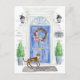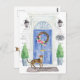 Announce your new address with our stylish announcement featuring a Abyssinian cat, blue front door, welcome mat, slate sign, topiaries and a floral wreath set on a gray brick background.