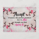 Beautiful inspirational postcard design featuring watercolor pink flowers on a rustic barn wood and in the center of it the text: "Accept whatever the present moment has to offer as though you had chosen it."