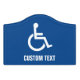 Accessibility sign. Wheelchair symbol. Stylized white person on a wheelchair. Blue background. Custom text.