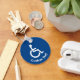 Accessibility sign. Wheelchair symbol. Stylized white person on a wheelchair. Custom background color. Custom text on both sides.