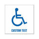 Accessibility sign. Wheelchair symbol. Stylized white person on a wheelchair. Custom text.