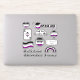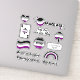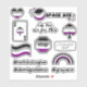 An assortment of asexual stickers with the black gray white and purple asexual flag, ace of spades, fun hashtags, a stop sign, an ace rainbow and more.