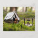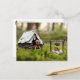 An acorn elf in a tent at the campsite. Summer camping postcard.