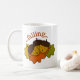 These cute acorns are getting ready for cooler autumn weather by falling asleep on a bed of orange, yellow and green oak leaves.