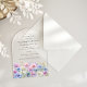 Elegant watercolor asters create a floral border at the bottom of this arch-shaped acrylic birthday invitation. The soft pastel purple, pink blue and white flowers are the September birthday month flower making this the perfect theme for your September birthday.