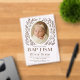 This design features a soft oval baby portrait framed by delicate hand-drawn botanical wreaths and a subtle cross at the top, creating a warm and faith-filled composition. The light wood background adds a rustic, natural touch, while the elegant serif typography gives it a timeless and graceful feel. Neutral beige and brown tones make the layout feel calm, gentle, and heartfelt. It would appeal to families looking for a classic Christian baptism design with a sweet baby photo and understated floral detail.