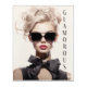Elegant fashion illustration of a platinum blonde model with her hair loosely pulled up, dark sunglasses, pink pouty lips, and diamond stud earrings. She wears a crisp black taffeta bow tie at her neck, adding sophistication to the chic design. The word "Glamorous" in vertical font complements her poised look, making this acrylic and watercolor art a perfect addition to any modern fashion lover’s collection.