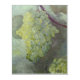 The painting depicts a cluster of grapes in shades of yellow and green, hanging from a vine. The grapes appear plump and translucent, catching light that enhances their fresh, juicy appearance. The leaves surrounding the cluster are a vibrant green, with delicate veins visible, adding depth to the scene. The background is softly blurred, bringing the focus to the grapes and giving the image a sense of calm and ripeness, as though it is a warm late summer day. The colors are soft, natural, and evoke a sense of abundance