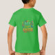 The t-shirt design features the text "Act, Save Earth" in large, colorful letters. The letters are stylized with a textured, almost hand-drawn look, and the colors are vibrant and eye-catching. The background of the design is a dark blue, which helps to make the text pop. There are also some small, colorful illustrations of leaves and flowers scattered around the text. Overall, the design is bold, colorful, and eye-catching, and it effectively conveys the message of environmental protection.