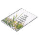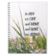 Inspirational quote scripture notebook, journal depicts a nature photograph of a meadow with green blades of grass and wildflowers. It features an encouraging Bible Verse, Acts 17:28, "In Him we live and move and have our being."