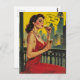 This image features a vintage-style illustration of a woman dressed in a red gown. She is seated on a balcony, holding drinks in both hands. The background showcases a cityscape with tall buildings, suggesting an urban setting. The overall aesthetic is reminiscent of mid-20th century advertising.