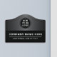 Custom sign with your company logo on a dark gray satin gradient background and customizable business name and additional line of text on a black background below. You can change fonts and font colors with the design tool.