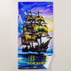 Add Name, Stylized Brown Pirate Sailing Ship Blue Beach Towel