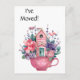 This is an I've Moved whimsical postcard watercolor illustration featuring a fairytale two-story pink home with blooming flowers in a teacup. Easily add a photo and personalize front and back using the Template provided. Made and printed in the USA, size is 4.25" x 5.6". See "About This Product" at side for more information. High reviews. If you choose not to add a photo, see my non-photo matching postcard.