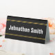 This black tabletop sign has white display text that you can edit to show a custom message such as your name. The faux gold lines that are above and below the text are not made of foil.