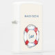 A cute, nautical watercolor design featuring a life preserver & script text phrase.