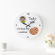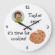 Add a photo to this cookie themed wall clock to make a funny, personalized gift for the person in your life with a sweet tooth. It's simple to add a name and the other text can also be customized to create a fun slogan of your choice. The image depicts a pair of choc chip cookies, and one has a bite missing.