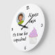 Add a photo to this cupcake themed wall clock to make a funny, personalized gift for the cake crazy person in your home or office. It's simple to add a name and the other text can also be customized to create a fun slogan of your choice. The illustration of a cupcake has pretty lilac frosting covered in balls and stars, and is shown in a white paper case.