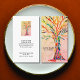 This unique business card is decorated with a print of a mosaic tree made of tiny pieces of brightly colored glass on a background in soft shades of coral, beige and ochre.