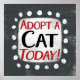 "Adopt A Cat Today" is a cute text design in gray with black and red text. It sits on a white accent shape and cute white polka dots surrounding it.