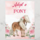Adopt a pony sign for pony horse equestrian party with pink flowers cute horse on a pink background.