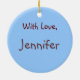 Lightweight, smooth, pure white ornament with nice sheen. Perfect size to be seen from across the room ... and to attract closer inspection! Price was great for ordering enough for the whole family! Clear, bold black design just as requested. Matches the order exactly. Just so nice!
