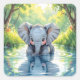 These stickers have a cute watercolor cartoon chibi ai illustration of a baby elephant drinking out of a lake while looking at his own reflection.