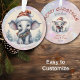 Here's a cute Christmas ornament for that special grandson or granddaughter! A baby white elephant wears a striped Santa Claus hat and wreath scarf on the front. Behind him is a snow covered pine tree landscape. The image is placed on a pink and lavender bokeh background. The back of the ornament has the same bokeh background with your custom text and a 2nd elephant image. It's personalized, and easily adapted for a gift for anyone; just change the text.