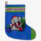 The sweet cartoon elephant on this charming Christmas stocking rings the bell to bring everyone into a joyful Holiday mood. Sitting between piled gift boxes and a Christmas tree, he wears a Santa hat, a big bright scarf and a warm smile. The bright colors add to the stunning beauty of this hand-painted original design. The text filed can be easily amended to become your alternate wish or a name. An original design available exclusively at ©EleSil online store.
