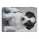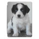 Cute portrait photograph of a black and white puppy sitting obediently for the camera.