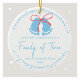 Celebrate your first Christmas as a family of three with this charming ornament. The festive winter design allows you to add a family name or first name on the front, making it uniquely yours. Featuring adorable blue footprints tied with a bow, it’s perfect for marking this special milestone. Personalize it with your family's names and the year to create a treasured keepsake that captures the joy of the season. Order today to add a festive touch