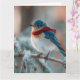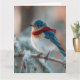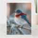 An enchanting and heartwarming close-up of a tiny Bluebird, its vibrant blue and white plumage beautifully highlighted as it sits perched on a frost-covered evergreen branch. The bird is made even more charming by the addition of a small, red knitted scarf, creating a cozy and whimsical winter scene.