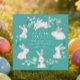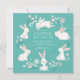 Adorable easter dinner invitation featuring white bunnies set on a turquoise blue back with pretty florals with a coordinating back.