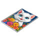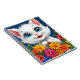 Adorable cartoon cat with fluffy white fur and large, expressive blue eyes. The cat is playfully peeking out from a vibrant bouquet of colorful flowers, including orange, pink, yellow, and blue blooms. Its small pink nose and cheerful smile add to its charm, creating a playful and inviting atmosphere. The background is a deep blue, enhancing the brightness of the flowers and the cat's features, making the overall scene feel lively and joyful.