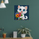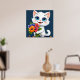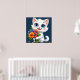 Adorable cartoon cat with fluffy white fur and large, expressive blue eyes. The cat is playfully peeking out from a vibrant bouquet of colorful flowers, including orange, pink, yellow, and blue blooms. Its small pink nose and cheerful smile add to its charm, creating a playful and inviting atmosphere. The background is a deep blue, enhancing the brightness of the flowers and the cat's features, making the overall scene feel lively and joyful.