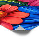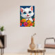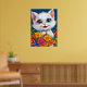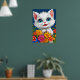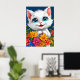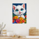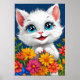 Adorable cartoon cat with fluffy white fur and large, expressive blue eyes. The cat is playfully peeking out from a vibrant bouquet of colorful flowers, including orange, pink, yellow, and blue blooms. Its small pink nose and cheerful smile add to its charm, creating a playful and inviting atmosphere. The background is a deep blue, enhancing the brightness of the flowers and the cat's features, making the overall scene feel lively and joyful.