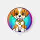 A cute cartoon puppy with a golden collar, sitting against a bright, colorful radial background, exudes charm and happiness.