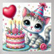 A cute gray cat wearing a party hat, sitting next to a decorative pink cake, accompanied by a lovely heart-shaped red balloon on a colorful background, radiating joy and festivity.