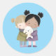 This adorable round sticker features a sweet pastel illustration of two children hugging, creating a warm and comforting feeling.