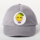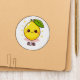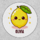 An adorable illustration of a cute kawaii yellow lemon with a happy face and a green leaf. It's surrounded by yellow sparkles and a pink shadow. A template below the illustration allow you to personalize.