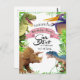 Dinosaur birthday invitations featuring a simple plain white background, jungle green foliage, a collection of dinosaurs, and a modern personalized birthday template that is easy to customize.