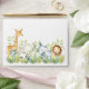 Cute jungle animals baby shower invitation envelope featuring a giraffe, lion, elephant & rhino surrounded by green jungle leaves. Add your return address info on the back envelope flap. Matching items available in our shop.