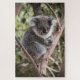 An adorable koala sits in a tree looking down at something with a quizzical expression. Photographed by Heather Enos in Victoria, Australia.