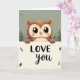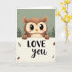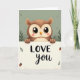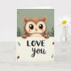 This card shows a sweet little owl in soft browns and creams peeking over a parchment-colored banner. Its big dark eyes have tiny white highlights, and its rosy cheeks and shy expression make it feel extra caring 🥰. The owl’s small segmented hands hold the top edge of the banner as if it’s gently presenting a note just for you. On the banner, the words “LOVE you” appear in flowing black cursive, centered and easy to read. Behind the owl is a muted sage green background with faint leaf shapes drifting around, giving a calm woodland setting. The banner is decorated with small green sprigs and two brown acorns near the sides, framing the message without distracting from it. It feels meaningful to give because the owl looks a little bashful but sincere, like it’s offering affection in a simple, honest way ❤️.