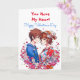 A sweet Happy Valentine's Day card depicting an anime boy and girl cuddling in a red and blue heart of flowers and hearts. On back is a coloring page where you can personalize the names. Valentine's Day card for him or her.